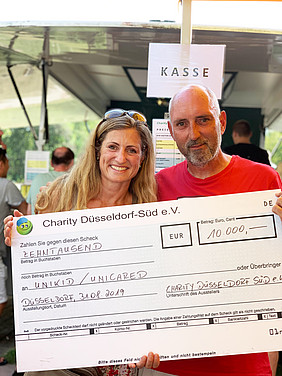 10.000 Euro: Diese Summe spendete Charity Düsseldorf Süd e.V. am vergangenen Wochenende an UniKiD und UniCareD des Universitätsklinikums Düsseldorf. Im Rahmen des jährlichen Familienfestes übergab der Vorsitzende des Charity-Vereins, Peter Scholtysik, einen symbolischen Scheck an Prof. Dr. Alexandra Bielfeld, stellvertretende Leiterin des UniKiD.
