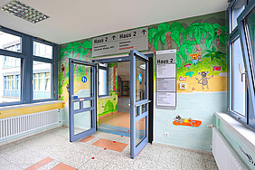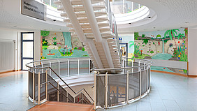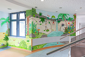 Dank einer Spende der Elterninitiative Kinderkrebsklinik e.V. strahlen nun Märchengestalten und verschiedene Tierwesen von den ehemals weißen Klinikwänden. Kinder und ihre Angehörige, aber auch Mitarbeitende können nun durch einen magischen Zauberwald und eine Unterwasser-Landschaft laufen. Gestaltet wurden die großen Gemälde mit vielen Details von den Künstlerinnen Nadine Augustat-Lehmann (Dipl. Raumdesignerin) und Bodil Zimmermann (Dipl. Grafikdesignerin).