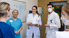 „Wir können erst einmal selbst entscheiden, haben aber die Sicherheit, dass immer jemand da ist“, lobt Caroline Jezoreck das Konzept. Auch sie durchläuft gerade das PJ. Und in der Tat werden die Beteiligten die gesamte Zeit über von Lernbegleiterinnen und -begleitern aus den unterschiedlichen Berufsgruppen unterstützt „Die machen das super. Und das Feedback, das wir erhalten, ist sehr viel wert“, so die Medizinstudentin. Zudem sei für sie der Austausch mit der Physiotherapie neu und wertvoll. „Die Physiotherapeuten haben noch einmal einen ganz anderen Blick auf die Patienten.“ Das sei insbesondere bei der Evaluation von Behandlungserfolgen wichtig. Die positive Einschätzung wird von Hanna Rabisch, Auszubildende in der Physiotherapie, geteilt: „Die IDA-Visite sowie die interprofessionelle Übergabe haben mir dabei geholfen, mich optimal und effektiv auf die Patienten vorzubereiten und eine an den Patienten angepasste, individuelle Therapie durchzuführen. Ich bin sehr froh, IDA so erlebt zu haben, um Teile des Projekts in meine zukünftige Arbeit mit einfließen zu lassen.“