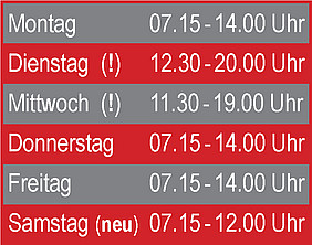 Samstag (neu) | 07.15 – 12.00 Uhr |