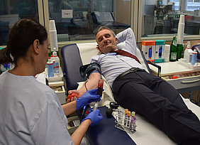 Oberbürgermeister Thomas Geisel unterstützt UKD-Blutspende
