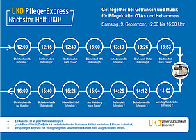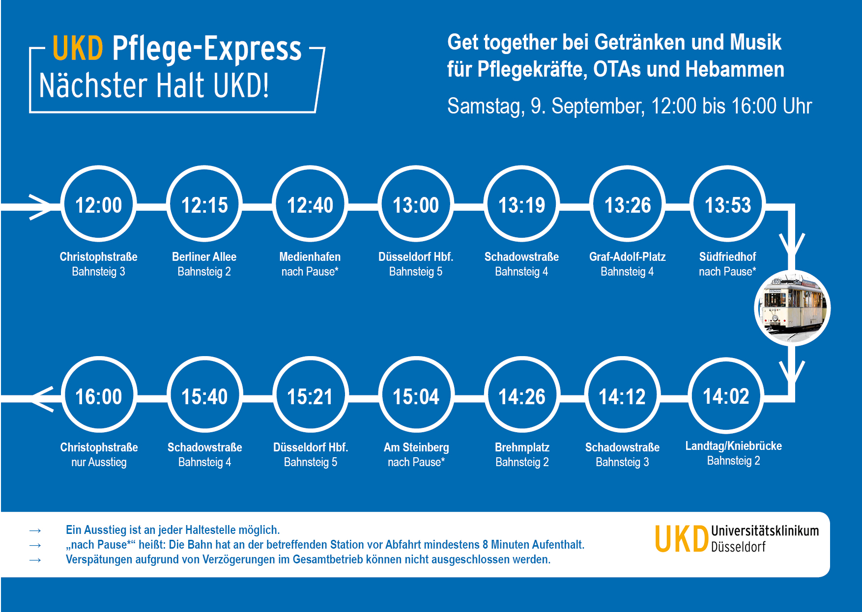 Direkt bewerben, Hospitanzen vereinbaren oder einfach nur mal Kennenlernen: Im UKD-Pflege-Express fährt ein Team der Uniklinik am Samstag, 9. September, von 12:00 bis 16:00 Uhr durch Düsseldorf, um auf die Qualitäten des UKD als Arbeitgeber aufmerksam zu machen. Interessierte Pflegekräfte, OTAs und Hebammen sind herzlich zu Gesprächen in besonderem Ambiente eingeladen.