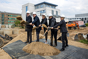 Prof. Dr. Frank Schneider (Vorstandsvorsitzender und Ärztlicher Direktor des Universitätsklinikums Düsseldorf), Düsseldorfs Oberbürgermeister Dr. Stephan Keller, Prof. Dr. Stefanie Ritz (Direktorin des Instituts für Rechtsmedizin), Prof. Dr. Ertan Mayatepek (Direktor der Klinik für Allgemeine Pädiatrie, Neonatologie und Kinderkardiologie) und Christiane Wiedow-Zillig (Projektmanagerin) nahmen den Spatenstich vor. Foto: Uniklinik Düsseldorf