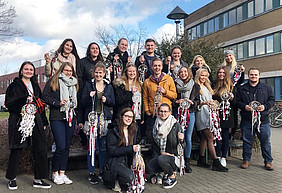 Von Anfang an war das Projekt eine Gemeinschaftsarbeit des ganzen Teams: Um die Materialien für die Traumfänger kaufen zu können, hatten die Azubis Kuchen gebacken und im Ausbildungszentrum für Gesundheitsberufe am UKD verkauft. Insgesamt 50 Meter Schnüre und mehr als 400 Perlen wurden dann verarbeitet. „Ich finde das wirklich eine ganz tolle Aktion unserer Azubis“, freut sich Thorsten Münse, Personaldezernent und Stellvertretender Kaufmännischer Direktor am UKD. „Im vergangenen Jahr wurden in dem Projektseminar Herzkissen für unsere Patientinnen im Brustzentrum genäht – in diesem Jahr sind es Traumfänger, mit denen unsere Azubis den Patientinnen und Patienten eine kleine Freude bereiten und ihnen Therapie und Genesung noch ein bisschen angenehmer gestalten können. Vielen Dank für dieses Engagement.“
