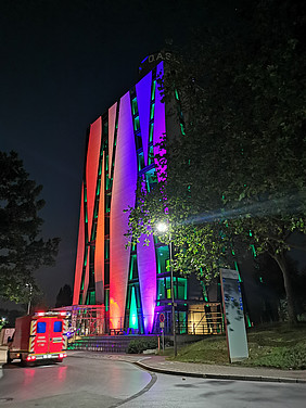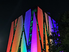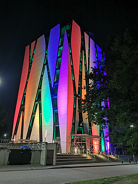 Als Zeichen für Toleranz und Vielfalt und gegen Ausgrenzung erleuchten das Universitätsklinikum Düsseldorf (UKD) und die Heinrich-Heine-Universität Düsseldorf (HHU) in Regenbogenfarben. Von Mittwoch, 23. Juni 2021 zum Eintritt der Dämmerung bis Freitag wurde das gemeinsam genutzte Gebäude der sogenannten O.A.S.E (Gebäude 16.61) in bunt erstrahlen