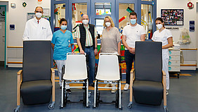 Der österreichisch-ungarische Schriftsteller Ödön von Horváth (1901-1938) hat einmal gesagt: „Bekanntlich braucht man zum Denken einen Stuhl, auf dem man sitzt.“ In einem Krankenhaus werden besondere Stühle aber nicht nur zum Denken, sondern auch in der medizinischen Versorgung der Patientinnen und Patienten benötigt. Die Kliniken für Allgemeine Pädiatrie, Neonatologie und Kinderkardiologie sowie für Kinder-Onkologie, -Hämatologie und Klinische Immunologie haben nun Dank einer Spende der Elterninitiative Kinderkrebsklinik e.V. vier dieser besonderen Stühle anschaffen können. Zwei elektronische Sitzwagen werden direkt in der Patientenversorgung eingesetzt - zum Beispiel beim Wiegen von Kindern und Jugendlichen. Zwei weitere Pflegestühle geben Eltern und Verwandten der in der Kinderklinik versorgten Patientinnen und Patienten die Möglichkeit in verschiedenen Positionen Kinder auf den Arm zu nehmen und so eine bessere Bindung aufzubauen. Des Weiteren können diese auch als Schlaf-/Ruhemöglichkeit für Eltern genutzt werden.
