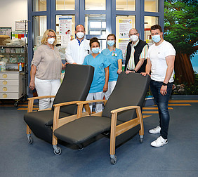 - Medizinisch versorgen oder einfach nur mal kuscheln – dafür sind die neuen Pflegestühle perfekt. (v.l.) Gabriele Hänsel (Vorstand Elterninitiative), Prof. Dr. Marc Remke (Oberarzt UKD-Kinderonkologie, Prof. Dr. Marc Remke (Oberarzt, Arbeitsgebiet: Pädiatrische Neuroonkologie), Lena Lange (stellv. Stationsleitung KK04), Johanna Hellmann, André Zappey (Geschäftsführung Elterninitiative) und Sebastian Beitzel (Stationsleitung KK01)