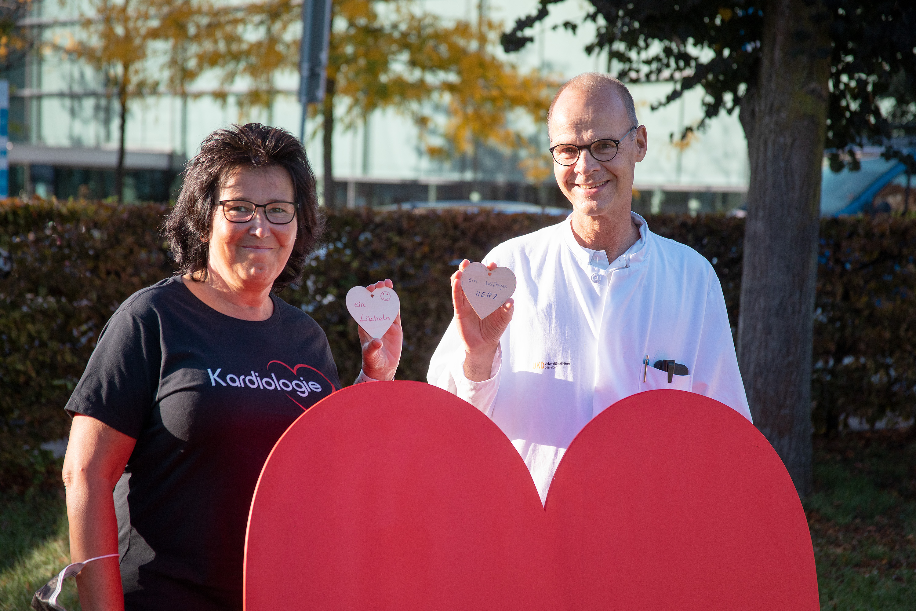 „Lebe dein Leben und sei glücklich“, „Wir schaffen das gemeinsam“, „Kraft, Mut, Zuversicht und Genesung“, „Stets ein Lächeln auf den Lippen“ oder „Lebe dein Leben, bleibe im Herzen jung“ – diese und andere Sprüche stehen auf mehr als 120 Holzherzen, die gerade auf dem Gelände des Universitätsklinikum Düsseldorf (UKD) ausgestellt werden. Die Herzen wurden in den vergangenen Wochen auf Initiative der Klinik für Kardiologie, Pneumologie und Angiologie auf dem Klinikgelände verteilt. Die Mitarbeitenden von Düsseldorfs größtem Krankenhaus konnten auf ihnen ihre ganz persönlichen Herzenswünsche für die Patient:innen formulieren – die Wünsche reichen von aufmunternden Worten bis hin zu dem Versprechen gemeinsam mit dem Patient:innen durch die Zeit der Krankheit zu gehen.