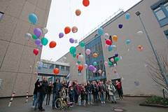 „Lass dich nicht hängen, kämpfe für dich, damit dein Umfeld nicht zerbricht“, stand auf einer der Karten, die an bunten Luftballons hingen. Schülerinnen und Schüler des zweiten Lehrjahres der Gesundheits- und Krankenpflege am Universitätsklinikum Düsseldorf ließen sie am Freitag, den 17. Februar 2017, an der MNR-Klinik gemeinsam mit Patienten steigen. Als Projekt im Modul „Tumorkranke Menschen pflegen“ hatten sie Wünsche und Hoffnungen von Onkologiepatienten aus der Kinder-, Frauen- und MNR-Klinik gesammelt, um diese gemeinsam steigen und so symbolisch loszulassen. Unterstützt wurde die Aktion durch Torsten Rantzsch, Pflegedirektor der Uniklinik.
